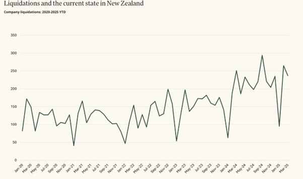 According to Centrix's March Credit Indicator Report, business liquidations increased 37% over the past year. Meanwhile, Companies Office reports that 597 companies were placed into liquidation from January to March 2025 alone.