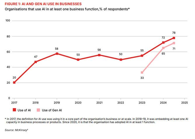 The report references a McKinsey survey that states 71% of respondents have adopted Gen AI tools in at least one business function. This number was 65% in 2024 and 33% in 2023 (when Gen AI was in its early stage). The use of AI has also increased from 55% in 2023 to 78% in 2025.