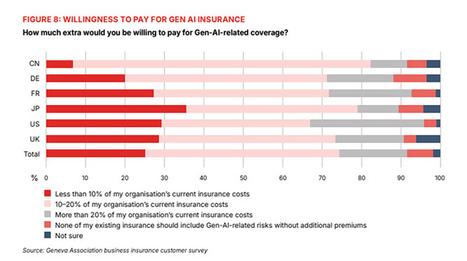More than 90% of surveyed firms expressed interest in insurance for Gen-AI-related risks, and over two-thirds are willing to pay higher premiums for such protection. Demand is also highest for insurance that combines Gen AI risks into existing cyber insurance policies.