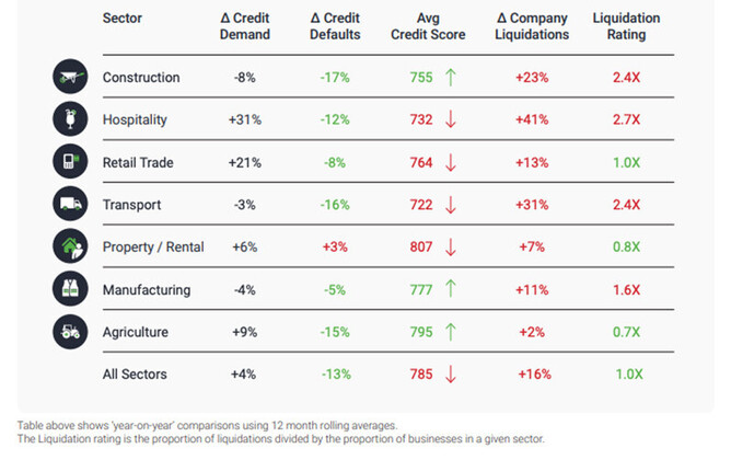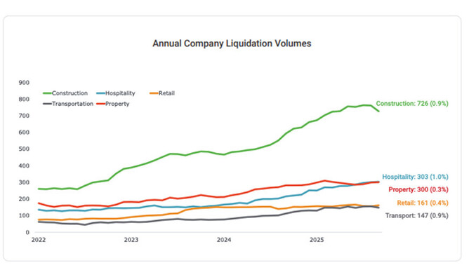 The construction and hospitality sectors are the two industries with the highest rates of company liquidation. 726 construction firms were liquidated in the past year (up 23% year-on-year increase), and 303 hospitality liquidations were recorded (up 41% year-on-year).
