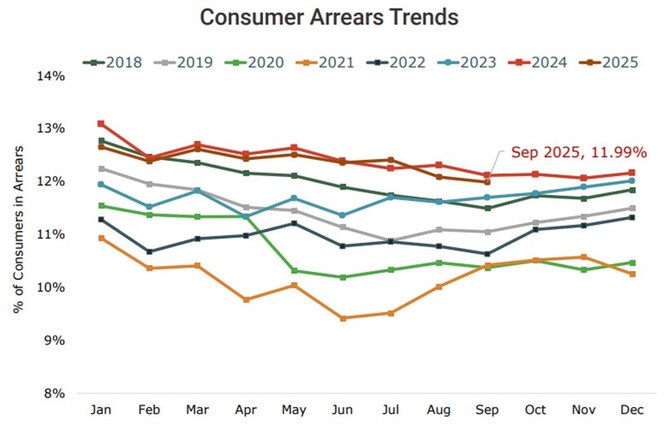 Consumer arrears continue to see improvements, as consumers reported in arrears fell to 11.99% of the credit active population in September. This is an improvement from 12.09% in August. Centrix also claims that the number of people behind on payments went down from 468,000 in August to 465,000 in September.